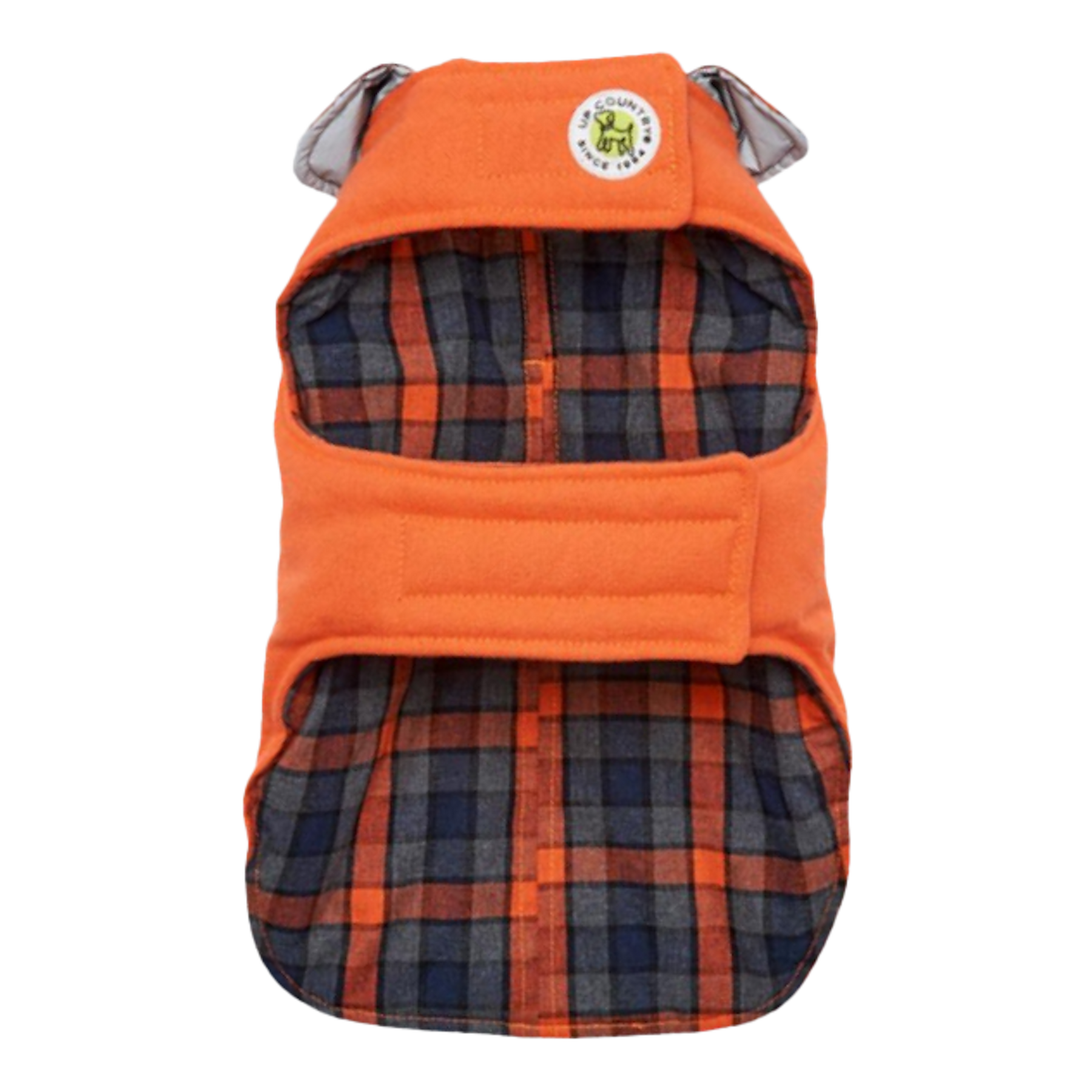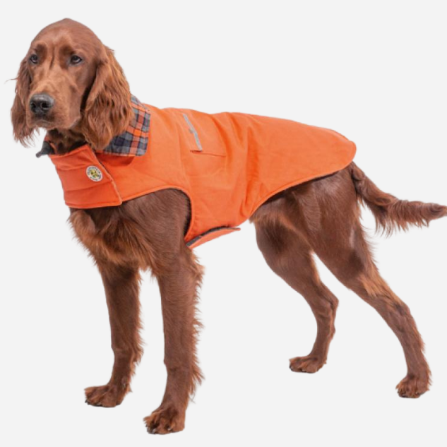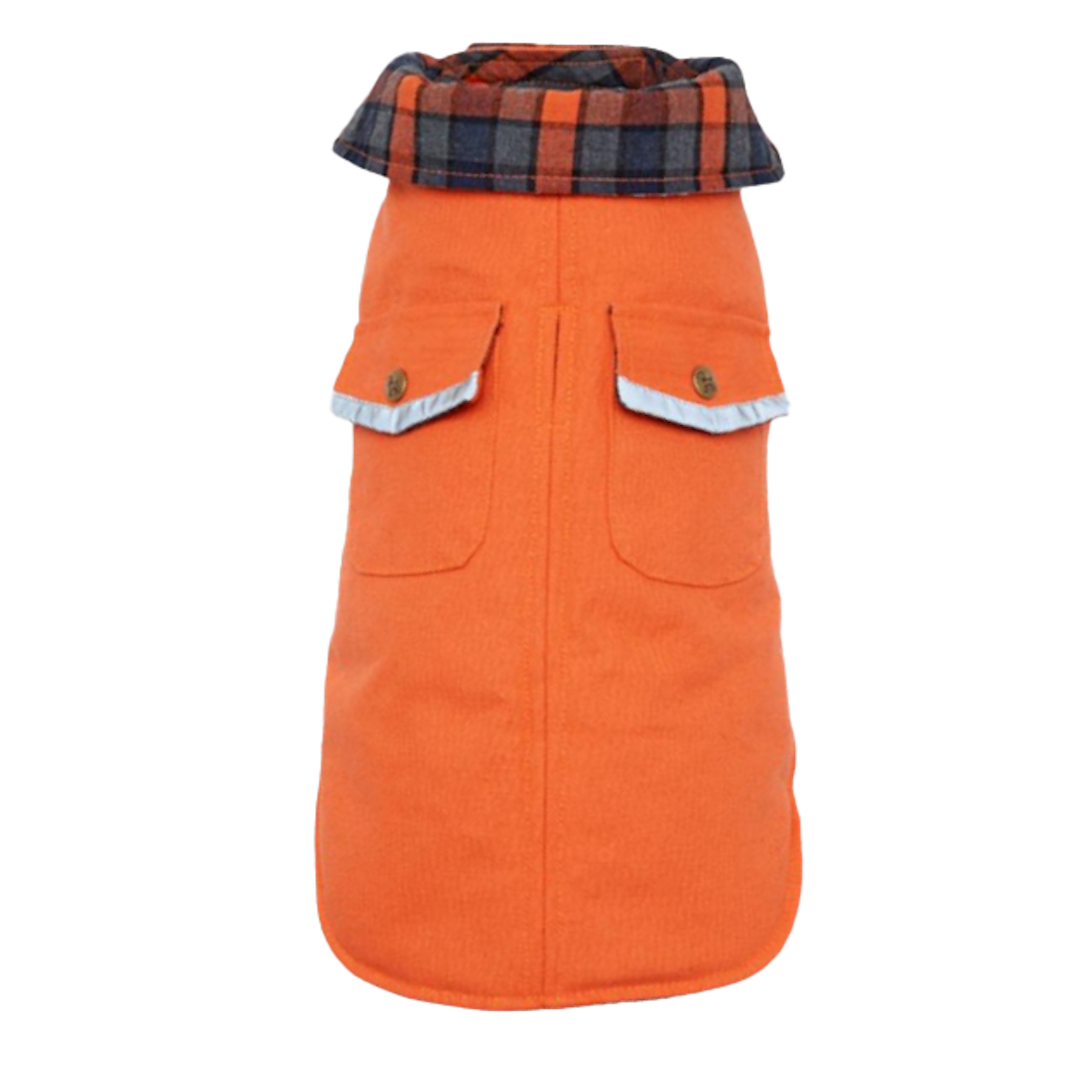 This Orange Field Coat Is A Great Way To Get Noticed In The Park Or During Woodland Walks! Orange Outer Coat Comes Complete With Reflective Details, A Cozy Plaid Lining, A Comfortable Fold Down Collar, And Snap Pockets To Hold Treats, Keys And More. Our Coats Offer Superb Quality And Stylish Options For Any Weather! Specifically Designed For Dogs On The Go, This Beautifully Detailed Coat Offers A Convenient Harness Opening (To Attach A Lead), Secure Hook & Loop Closures, And Is Tailored For Maximum Comfort And Coverage When Walking Or Running.