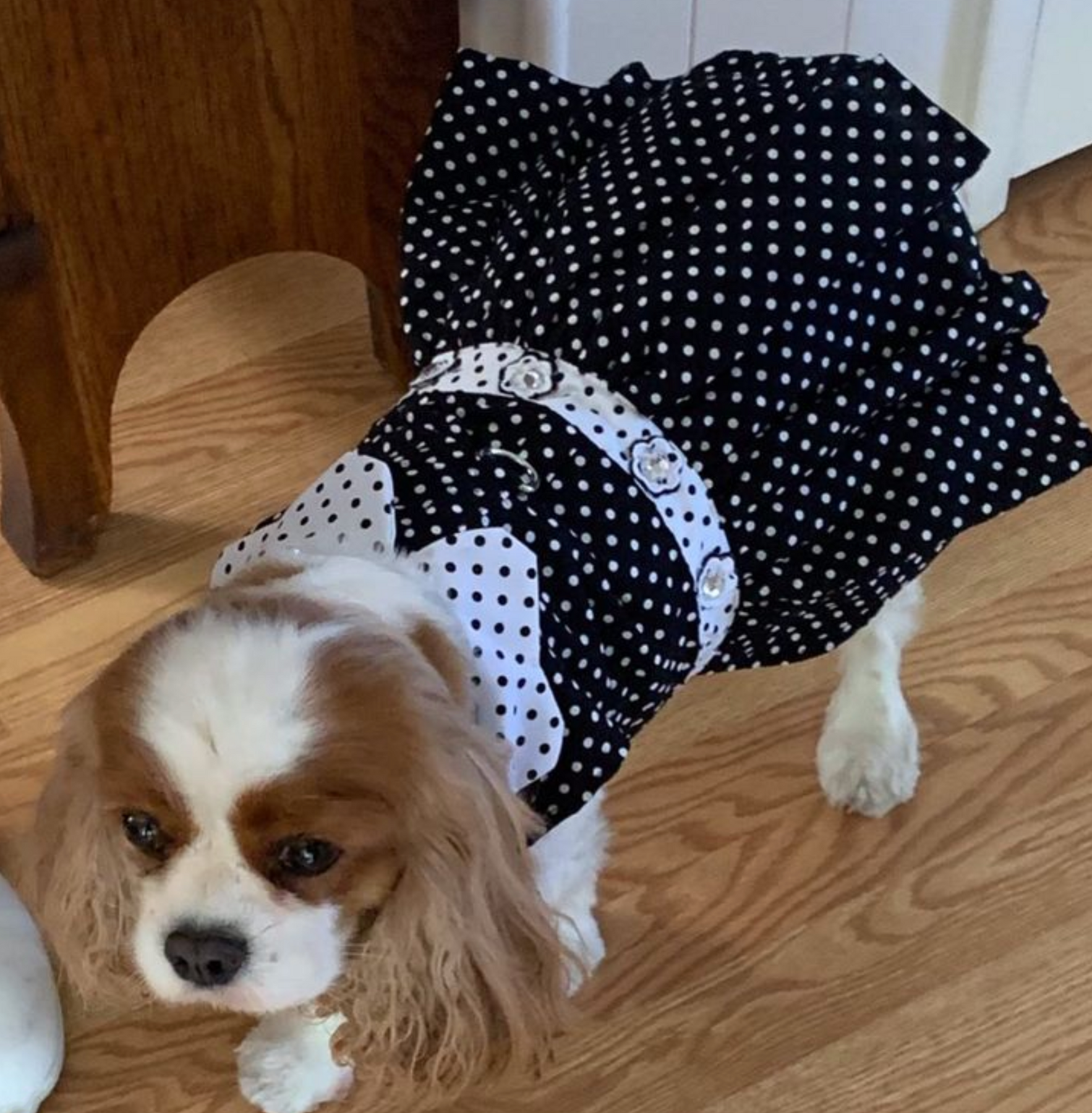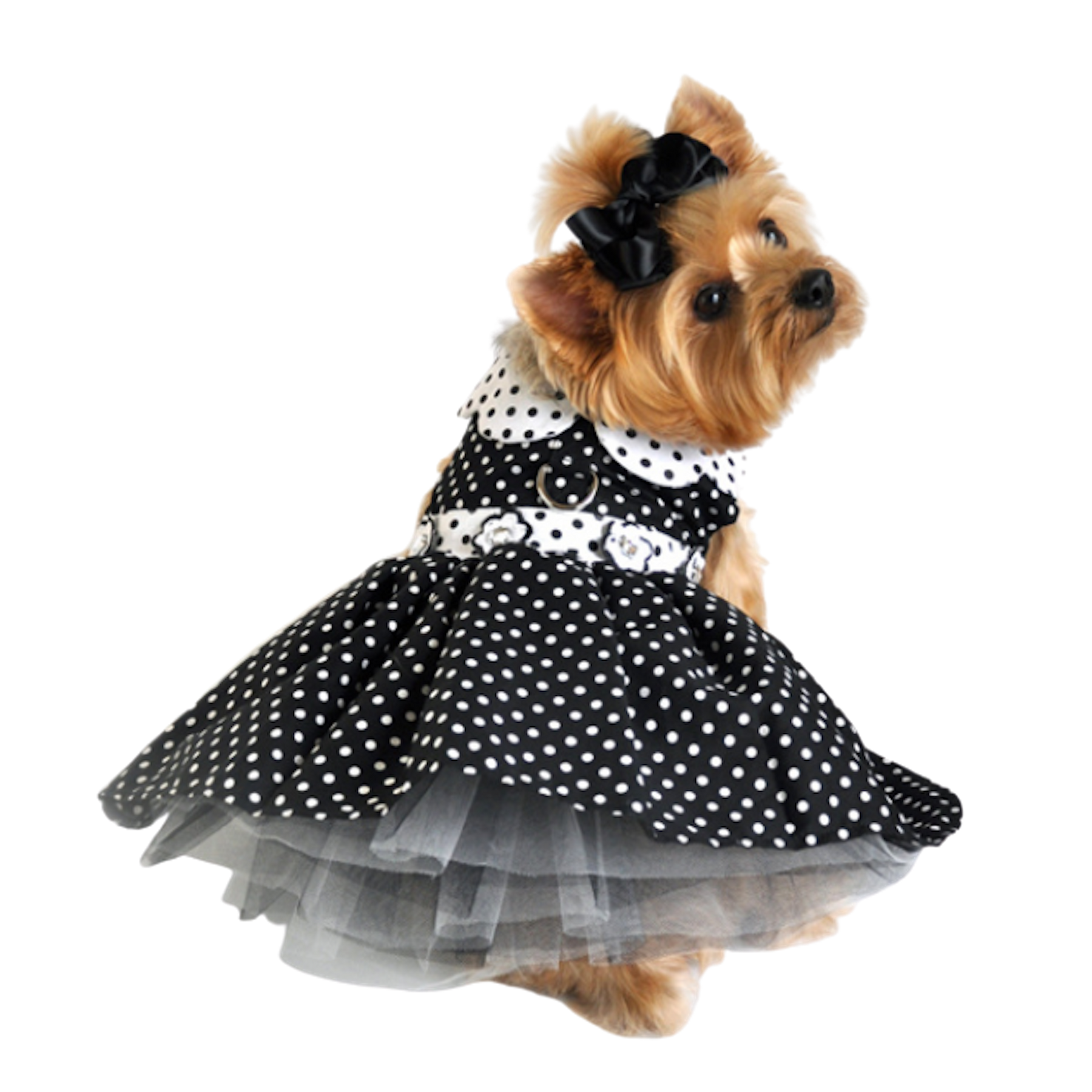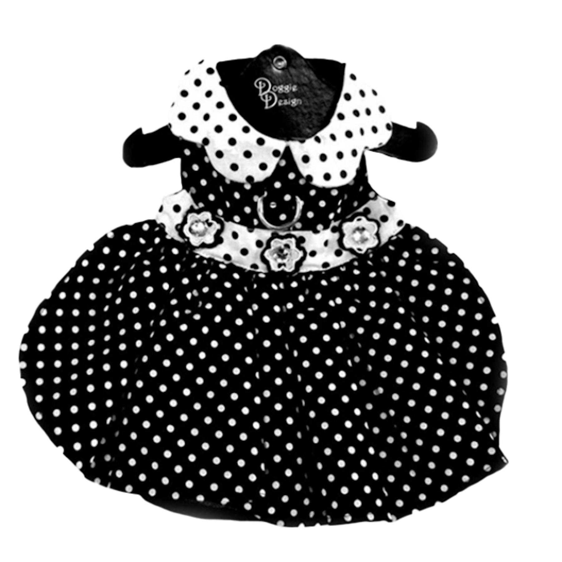 Floral Buttons With Rhinestone Centers At The Waist. Tulle Lining Under Skirt Makes A Fuller And Fashionable Look. This Makes Our Black And White Polka Dot Dog Dress Great Year Round For Parties!