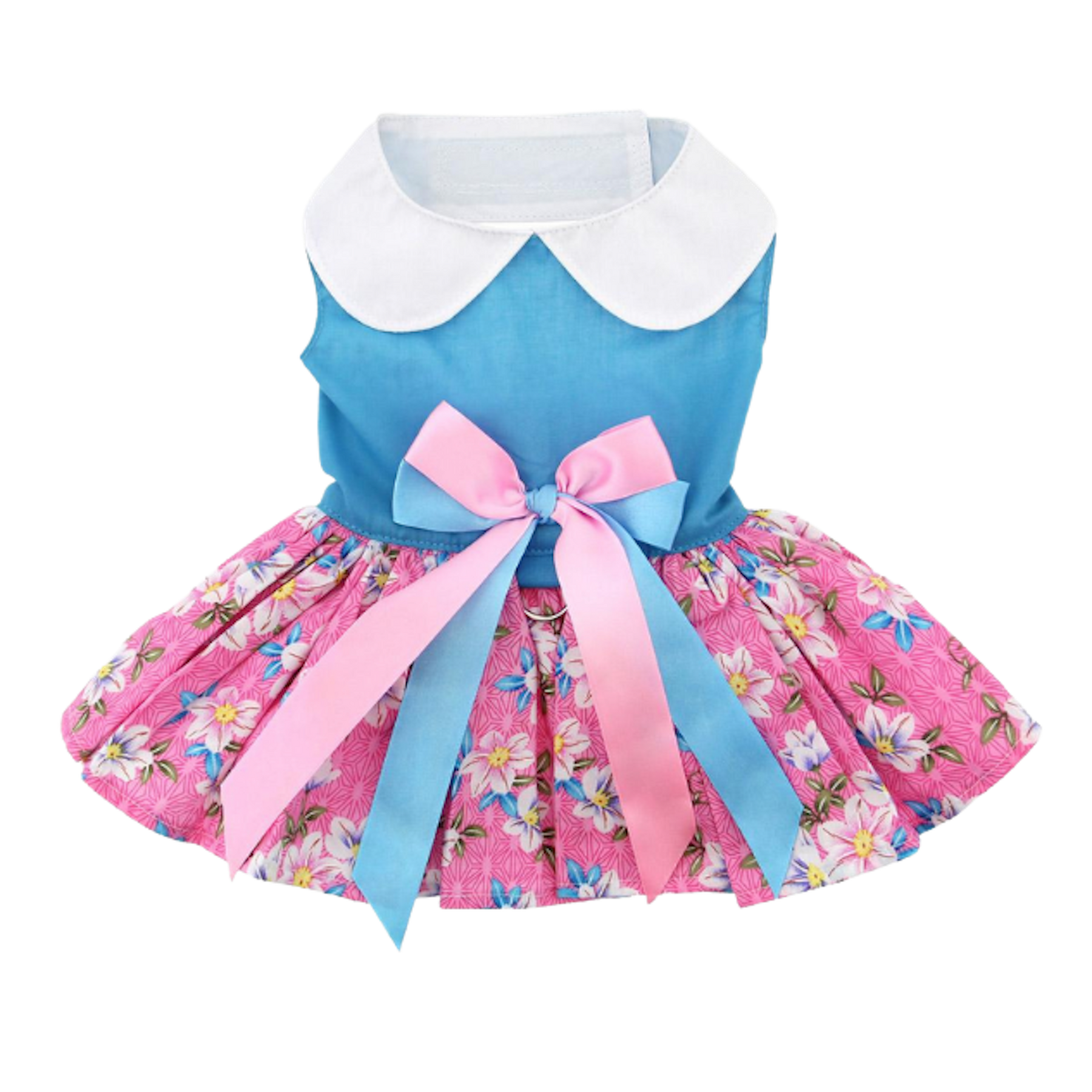 This Dog Dress Features A Spectacular Blue And Pink Plumeria Floral Pattern, But Don't Be Fooled By The Beauty Of This Dress - It Is Also Incredibly Functional.